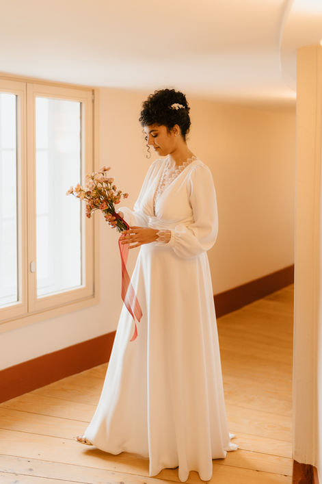 Lella est une robe entièrement en crêpe, avec quelques subtils détails de dentelle de calais en bordure de décolletés plongeants et émergeant des poignets aux découpes arrondies. Dans cette silhouette plus couvrante que les autres, une place importante est faites aux drapés qui se répondent, horizontaux, verticaux.